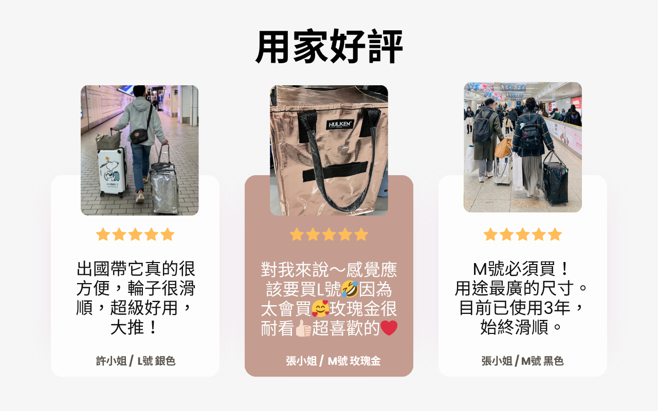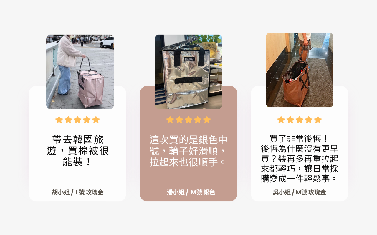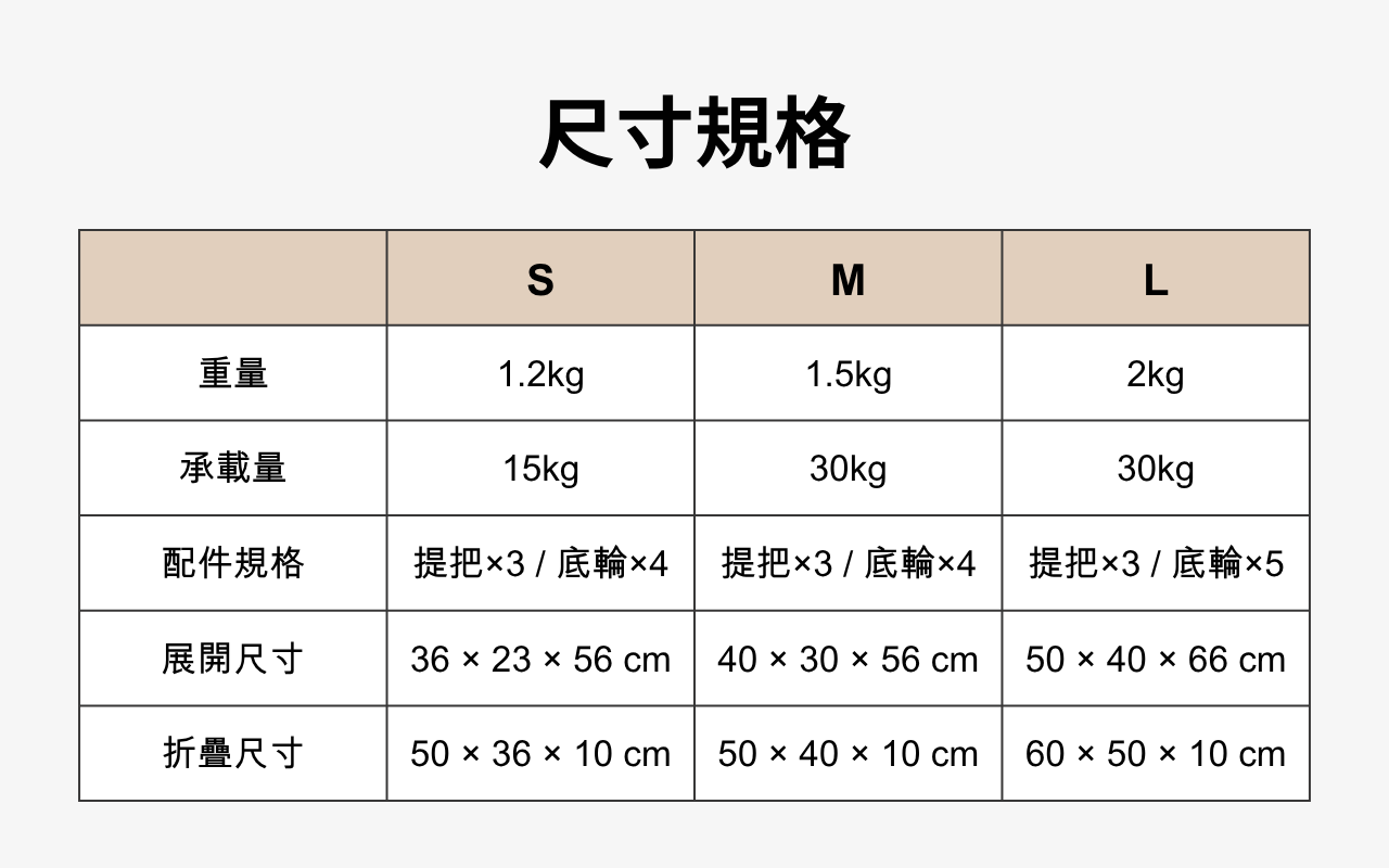 最大承重15公斤,輕巧易攜,最適合作登機行李或日常採購使用。